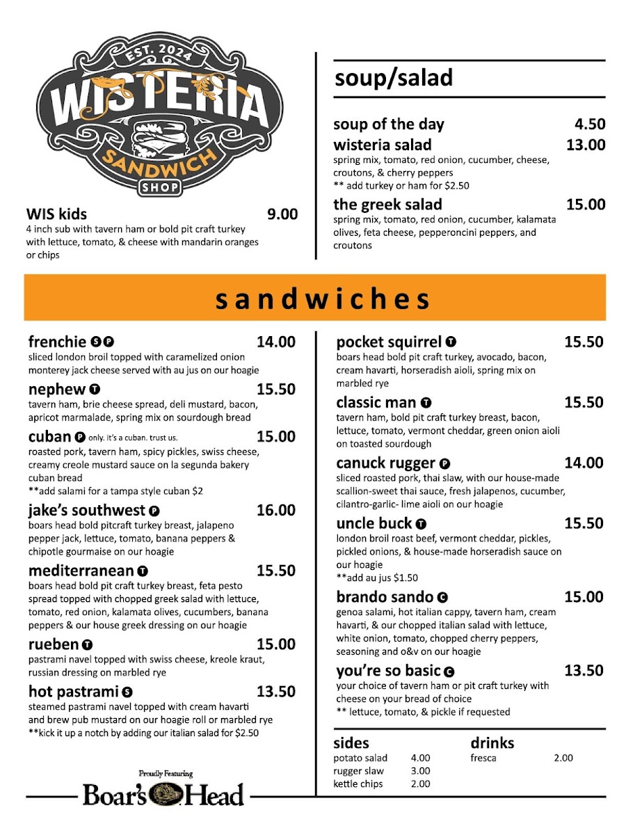 The Wisteria Sandwich Shop Menu offers a delightful mix of fresh, flavorful options that cater to a variety of tastes. From savory sandwiches to refreshing salads, there's something for everyone. For the younger crowd, the "WIS Kids" section provides kid-friendly options that are sure to please. The soups and salads section stands out with the ever-popular "Soup of the Day," which changes regularly to keep things exciting. If you're craving something more substantial, the Wisteria Salad is a great choice, featuring a vibrant mix of fresh ingredients, or opt for the Greek Salad, packed with tangy feta, Kalamata olives, and a zesty dressing.