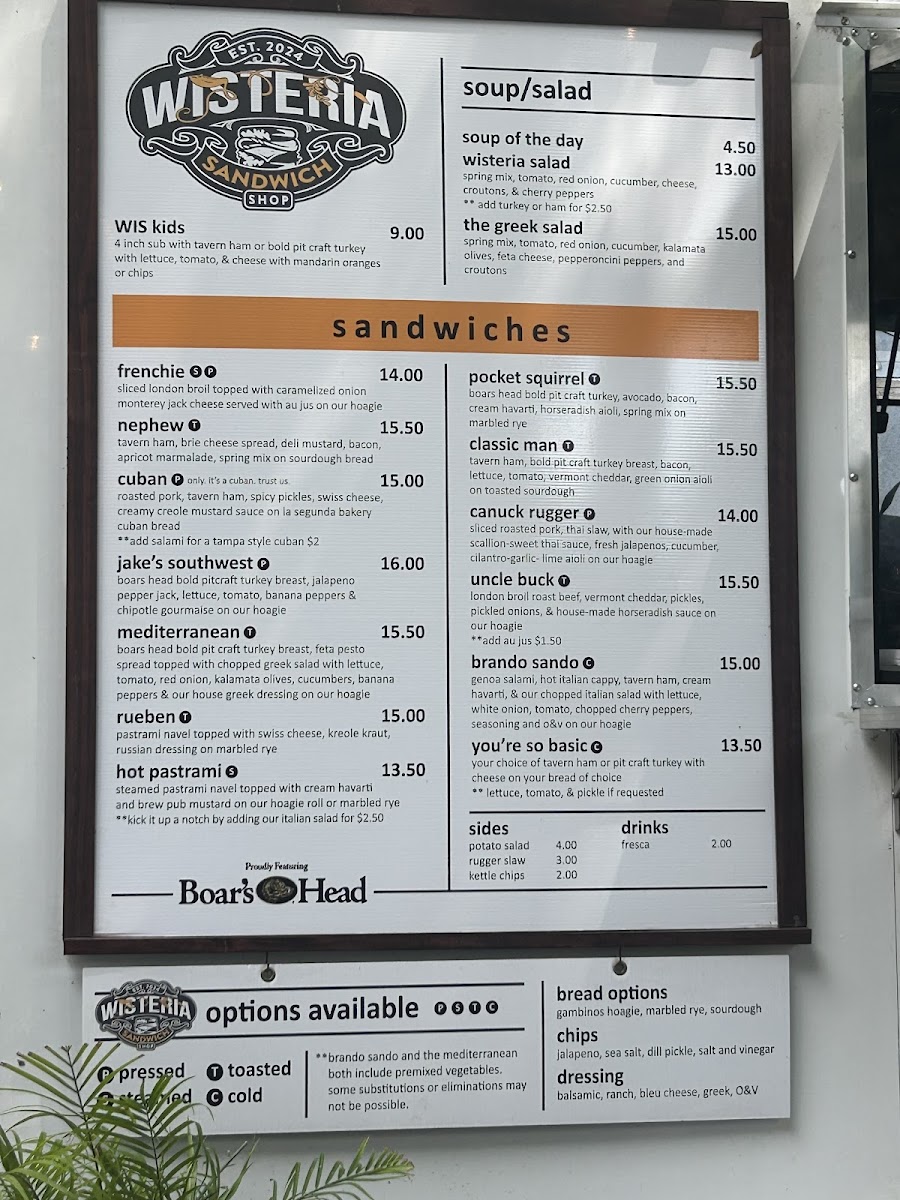 The sandwich menu is where Wisteria truly shines, offering a unique twist on classic favorites. The "Frenchie" sandwich combines savory ingredients for a truly indulgent bite, while the "Pocket Squirrel" adds a fun, unexpected twist with its combination of flavors. For something heartier, the "Nephew Classic Man" sandwich brings together a perfect blend of ingredients for a satisfying meal. The Cuban is another favorite, boasting bold flavors of roasted pork, ham, pickles, and mustard, all perfectly pressed. Each sandwich is a delicious adventure in flavor.